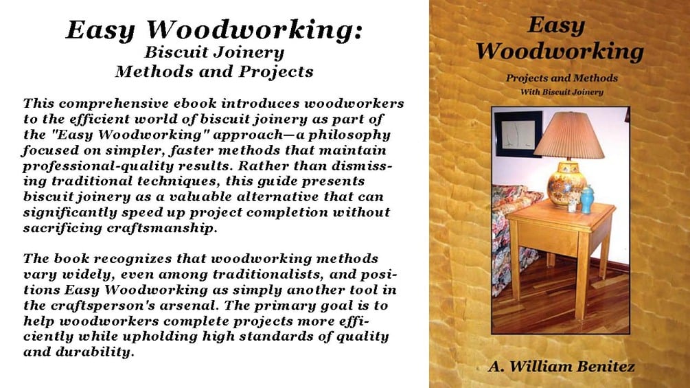 This comprehensive eBook introduces woodworkers to the efficient world of biscuit joinery as part of the "Easy Woodworking" approach—a philosophy focused on simpler, faster methods that maintain professional-quality results. Rather than dismissing traditional techniques, this guide presents biscuit joinery as a valuable alternative that can significantly speed up project completion without sacrificing craftsmanship.